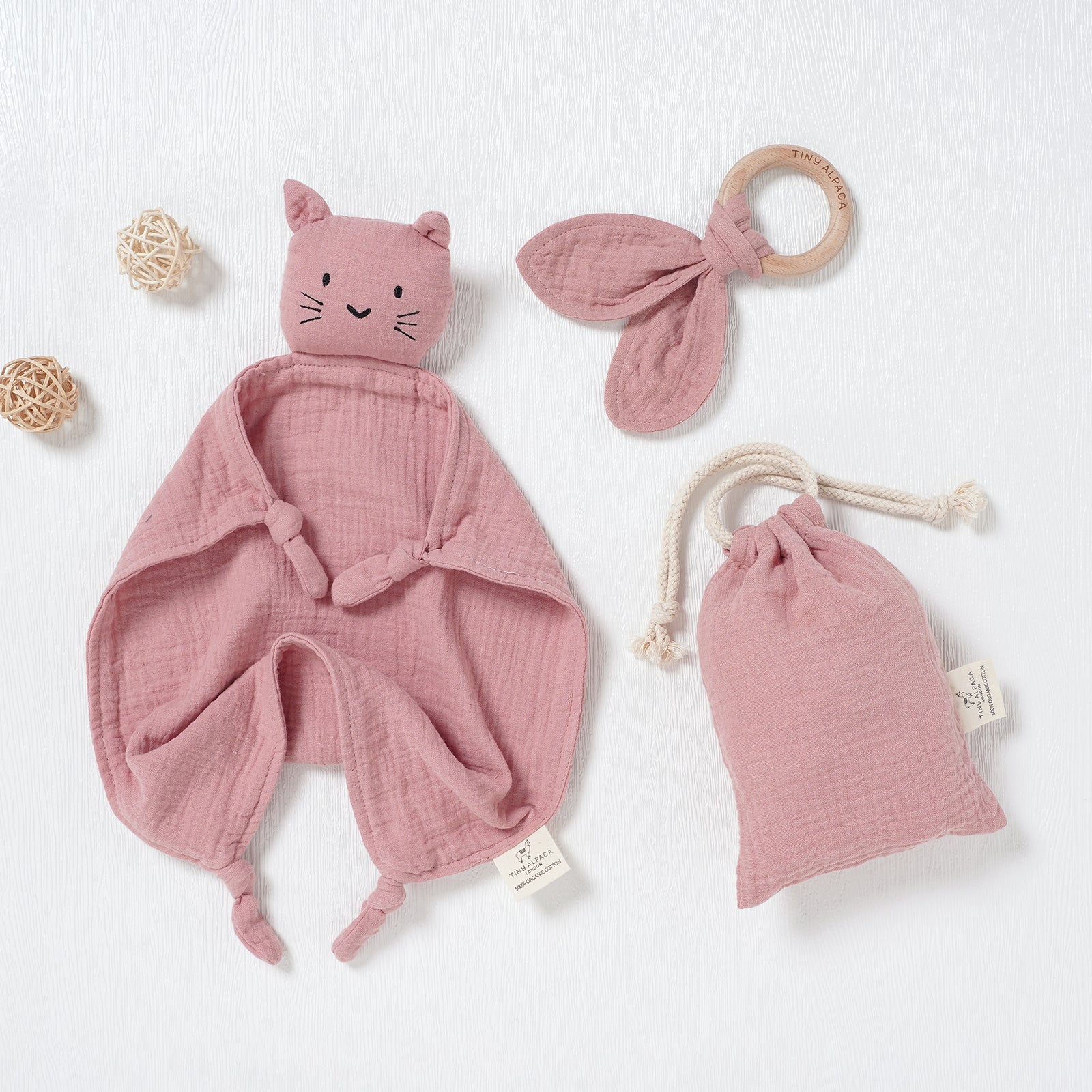 Cat Organic Cotton Security Blanket With Teether | 40x40CM - Tiny Alpaca UK